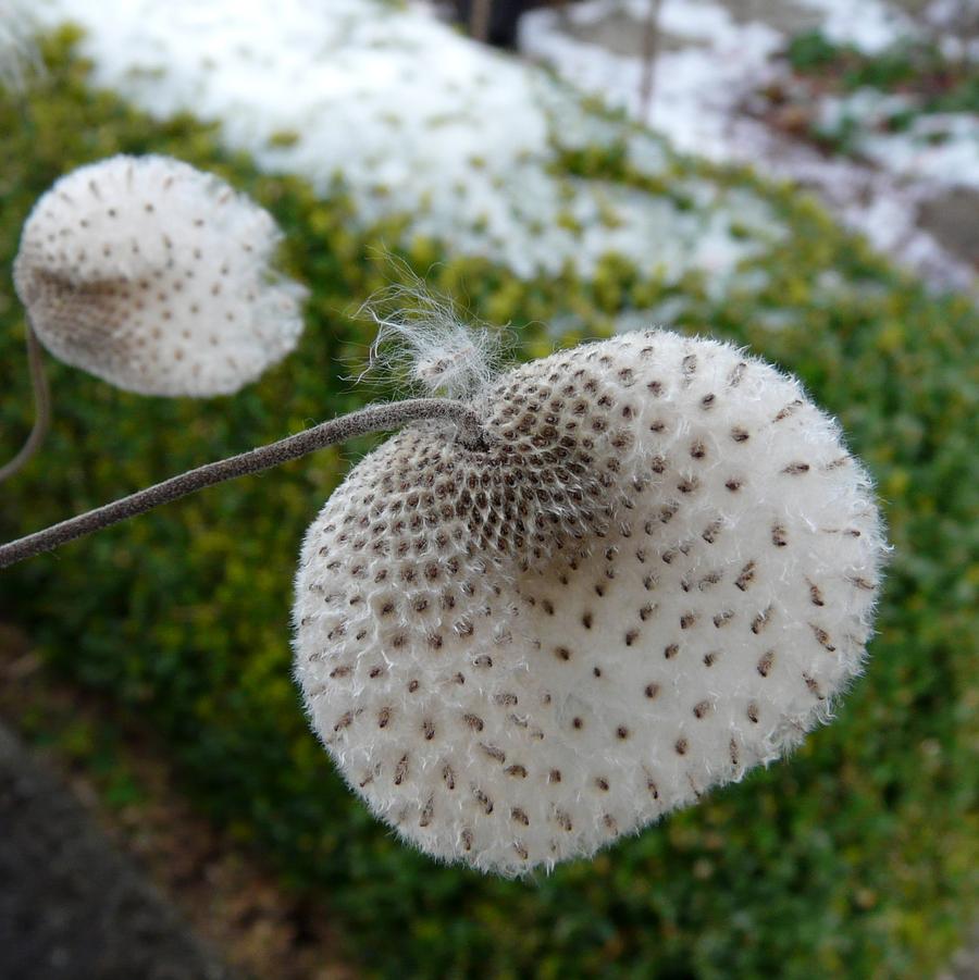 In mid-spring, it presents its sharply pointed foliage in rich colonies of mounded foliage. Through-out the spring and summer season it wants for nothing so far as maintenance when grown in part to full shade. Then, by mid-summer, the suspended pre-blooms appear above long, dark olive stems jutting through the lush mounds. The blooms burst from the ends of the wirey stems where the paper-light flowers move effortlessly in the slightlest breeze. The show doesn't end there. The spent blooms give way to an extraordinary seed head that appears as a ball of cotton on the end of the stem which holds all through the winter if left untouched.