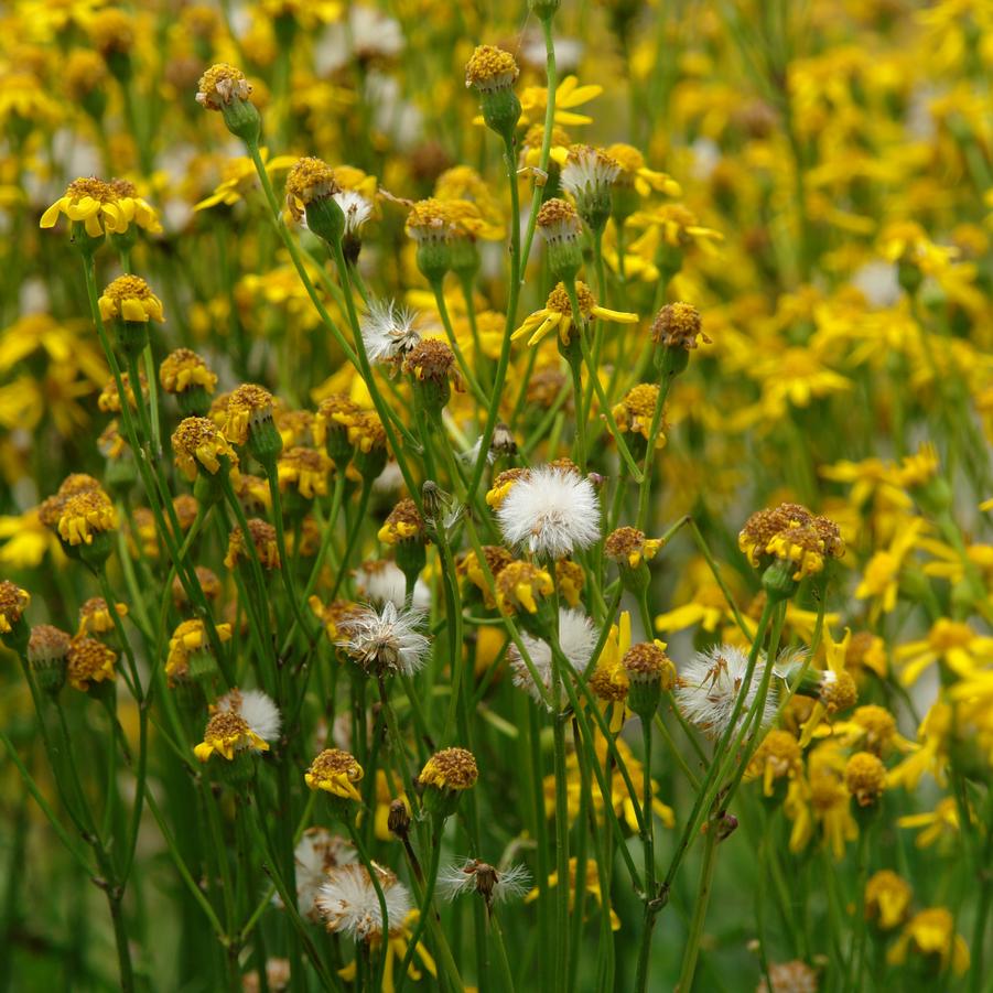 A tough groundcover, Packera obovata is similar to its popular cousin, Packera aurea, but with a smaller round leaf and the ability to withstand drier, full-sun conditions without losing its verdant appearance! Roundleaf ragwortl is highly-prized for its ability to quickly colonize open land and provide dense herbaceous cover in the landscape. The foliage forms a 4-6” tall mat with flower stalks reaching upwards of 12-18” tall. P. obovata is different than its cousin P. aurea by its more oval shaped basal leaves while P. aurea has a more round, heart-shape appearance. It blooms in April, typically blooming two weeks or so later than P. aurea.