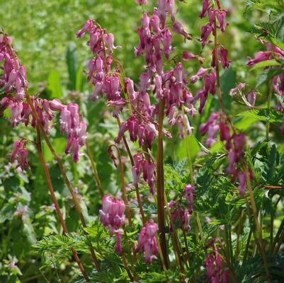 A popular plant for the shade garden, Dicentra eximia is a tremendous performer. The leaves are deeply cut and fern like. The pink flowers are oblong heart shaped with an inner petal that drips from the outer petals, creating the appearance that the heart is bleeding. The flowers are smaller and longer than the old-fashioned bleeding heart, but in long branching inflorescences that encourage a more floriferous species.